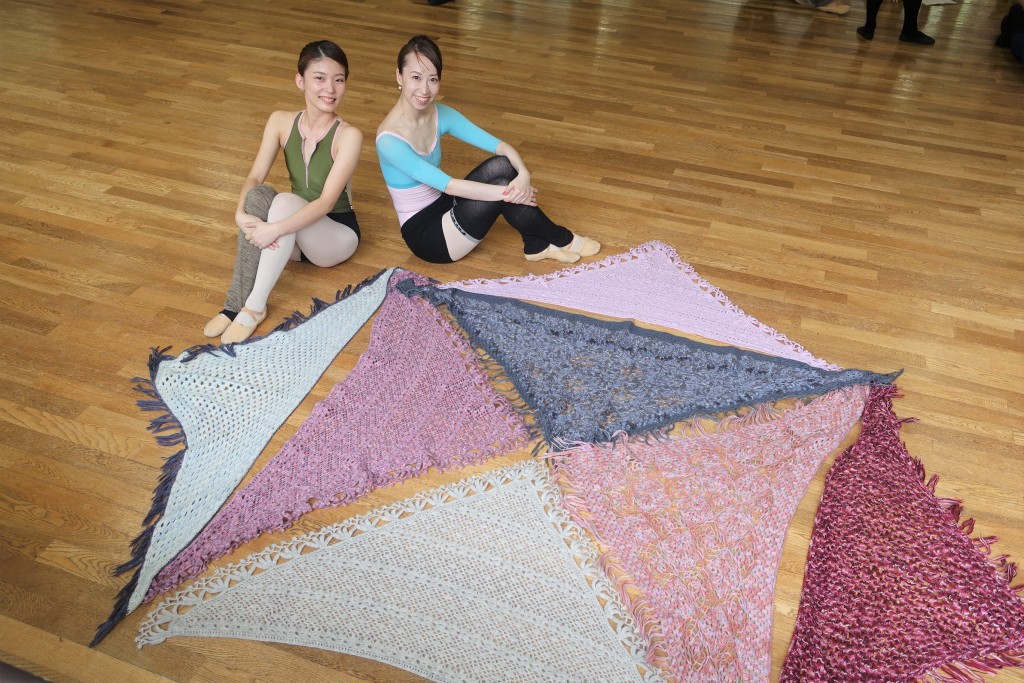 三角の腰巻は、腰はもちろん、肩にかけたり、首に巻いたりといろいろな使いかたができるそう。SDB内でも愛用者の多いこの腰巻、実は全部手作りだとか!ダンサー佐藤万里絵が編んだものと、ダンサー大森美香のおばあさまに作っていただいたものを使ってるダンサーが多いようです。手作りならではの温もりが伝わってきます。