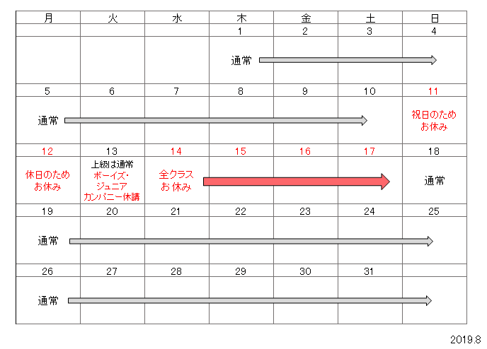 8月の休講のお知らせ 2019年07月13日 8月13日(火)ボーイズクラス・ジュニアカンパニークラス、14日(水)~17日(土)全クラスはお休みさせていただきます。 祝祭日もお休みとなりますので、8月は以下とおり営業いたします。ご了承ください。